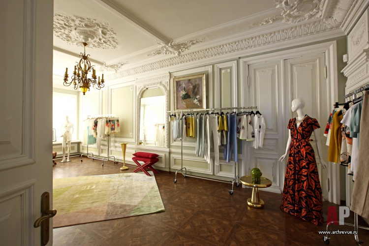 Отданное под бутик пространство некогда было частью дворянского поместья и имело эффектную планировку с большими окнами и перетекающими помещениями. Авторы проекта максимально постарались сохранить историческую структуру объема площадью 140 кв. м и спроектировали три основных помещения: два больших зала (каждое со своим настроением) и зону примерочных с мягкой мебелью и старинным фортепиано.