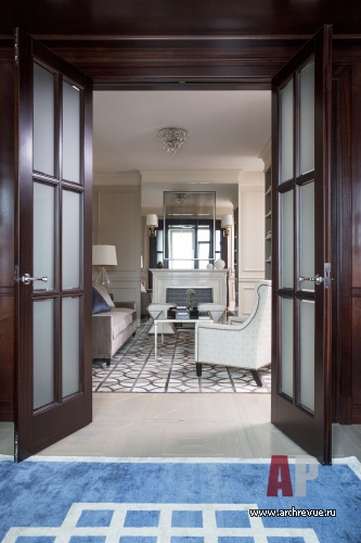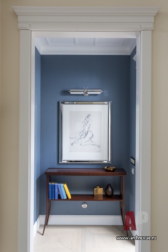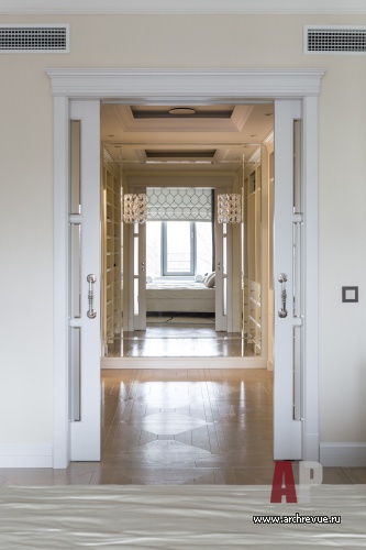 Помещения выстроены по принципу анфилады: строгой и торжественной. Встроенные системы хранения тщательно замаскированы стеновыми панелями, отчего интерьер коридоров и холла выглядит цельным.