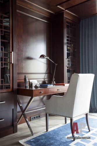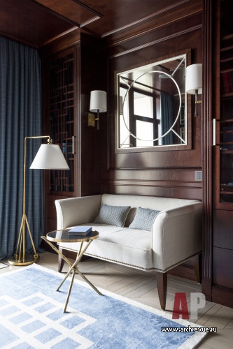 Кабинет диван Kravet Couture, столик Speer Collectibles; библиотека, на заказ, изготовление «Мастерские Palladio»