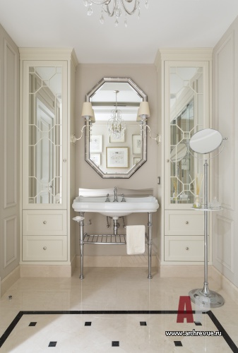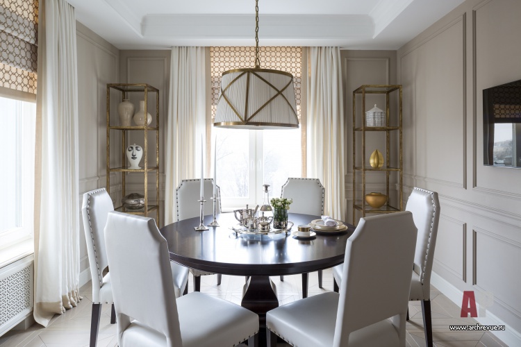 Теплая светлая цветовая палитра (оттенки серого и кофе с молоком и красное дерево) поддерживает классическую стилистку. Лепные карнизы, двери с витражами, изделия из мрамора и янтаря, аксессуары из латуни – все эти традиционные приемы работают на образ парадного интерьера с историей. При этом как таковых антикварных предметов и даже точных исторических реплик здесь нет, только стилизованная мебель, светильники и аксессуары американских и европейских марок.