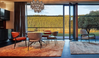 Центральное помещение квартиры – парадная столовая, совмещенная с кухней, условной границей между ними служит барная стойка. Гостиная с камином выглядит камерно, но благодаря соседству с кабинетом, где расположено французское окно, при раскрытых межкомнатных дверях она выглядит куда просторнее своих 20 кв. м. Приватные помещения – спальня, гардеробная, ванная – расположены в другом крыле квартиры.