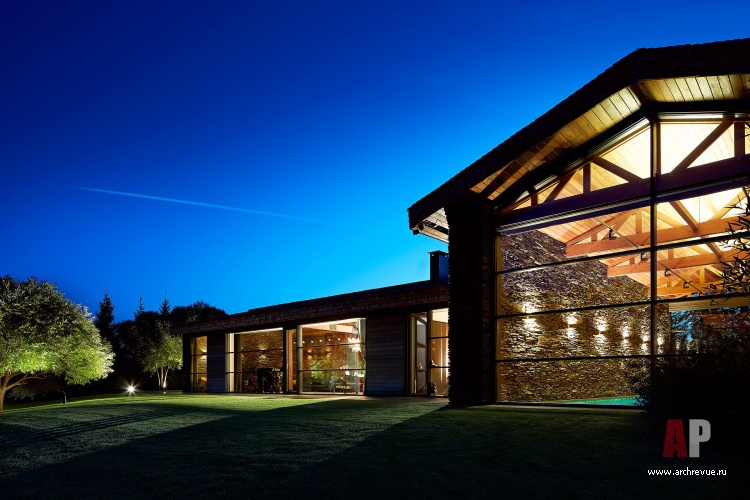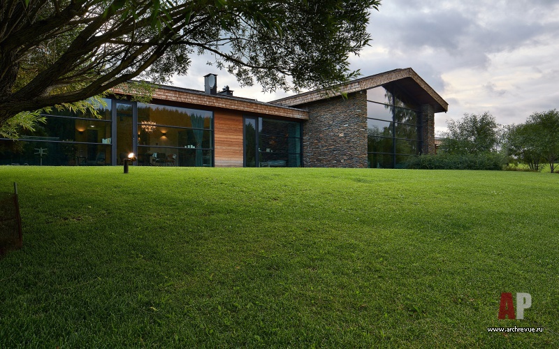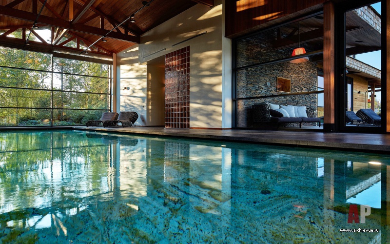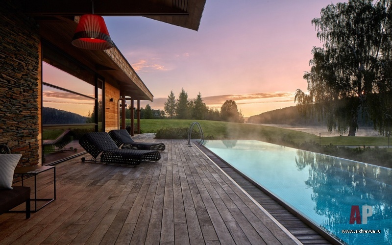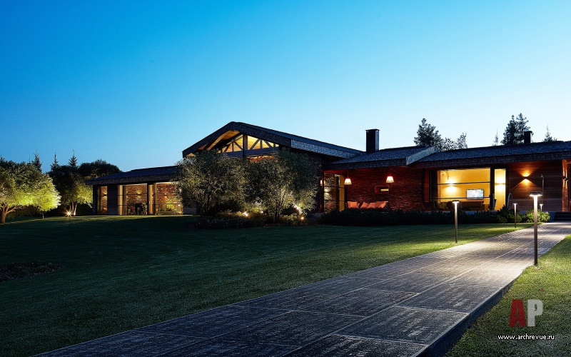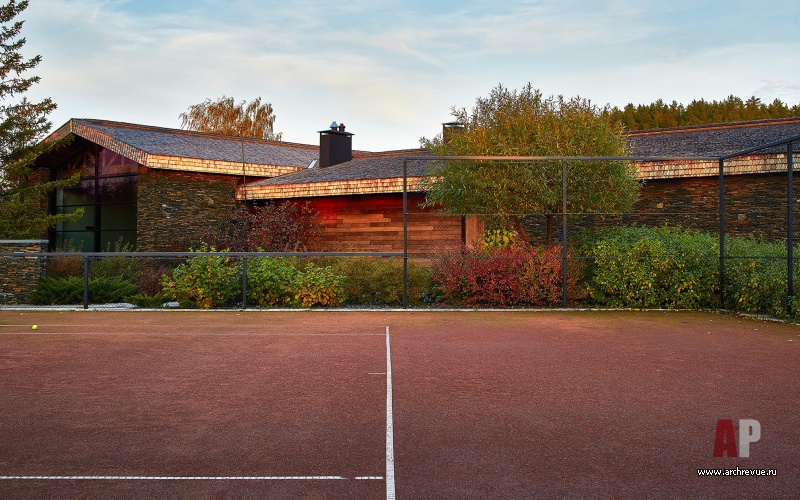 Для успешного бизнесмена и любителя большого тенниса архитектор Дмитрий Позаренко спроектировал и построил дом со СПА-комплексом и двумя бассейнами в традициях уральского зодчества XVIII века. Одноэтажная вытянутая по участку постройка максимально ориентирована на ландшафт: ее глухие стены обращены к дороге, а остекленные плоскости раскрываются во внутренний двор. Небольшая этажность позволяет дому слиться с пейзажем.