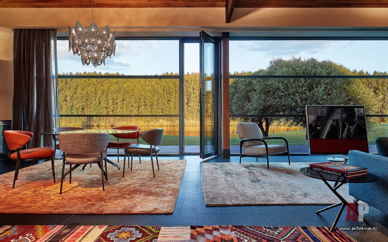 В интерьере гостиной и спален заметны отголоски стиля ретро: мебель, ковры, декоративные изделия и аксессуары выполнены в стилистике 1970-х годов, когда на первый план стал выходить функционализм.