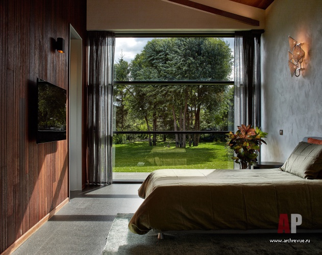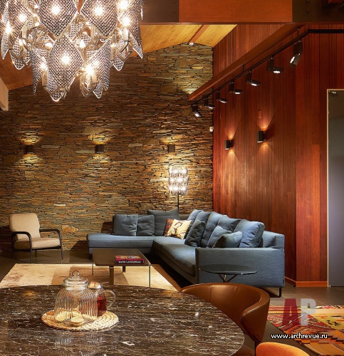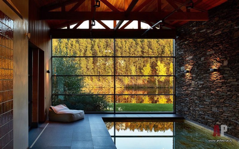 Интерьер дома под стать его экстерьерам: образ эко-жилья продолжают природные материалы с живописной текстурой. Полы жилых помещений выложены плитами из гранита, стены и потолки обшиты панелями разных сортов красного дерева (потолки декорированы древесиной меранти, терраса акцентирована доской ипе и мербау), а в бассейне ставка сделана на гранит и зеленый башкирский сланец.