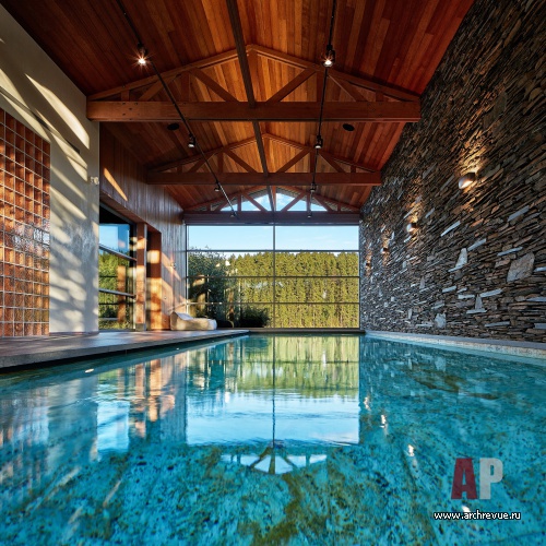Одноэтажная постройка площадью 297 кв. м распластана по ландшафту и набрана из трех объемов. Центральный из них – двухсветный бассейн с зоной отдыха (площадью 100 кв. м) и чашей под двускатной кровлей с открытыми массивными балками. По одну строну от бассейна располагаются жилые помещения: студийная гостиная с кухней, столовой и панорамными окнами, которые стирают границы между интерьером и экстерьером.