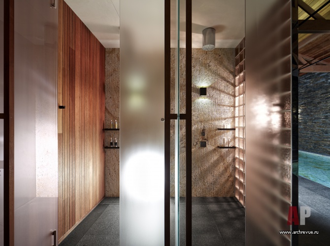 К общественному блоку примыкают две гостевые спальни с ванными комнатами. По другую сторону от бассейна находится SPA-комплекс с банями, сауной, душевыми, мини-бассейном и выходом на большую открытую веранду.