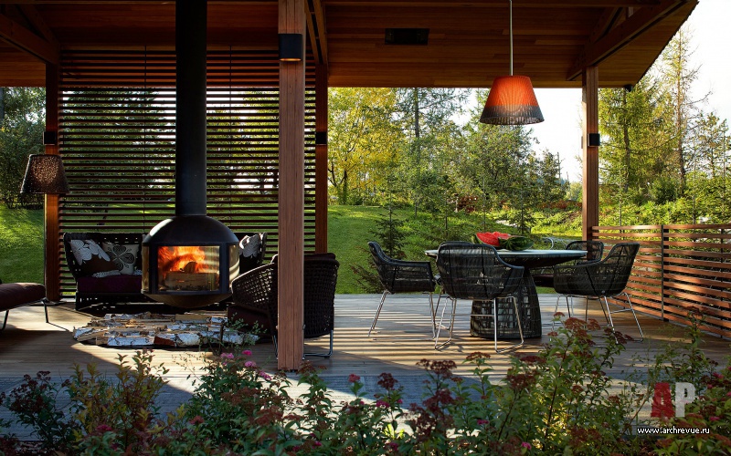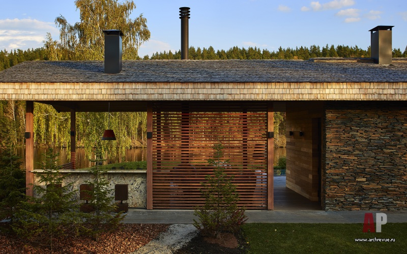 Прототипом дома послужили старинные амбары из сланца, которые издревле строились на Урале. Кровля постройки выполнена из лиственничной дранки, фасады облицованы башкирским сланцем, массивные балки и несущие элементы исполнены из лиственницы. При этом привычный архетип деревянного дома доведен до полного аскетизма форм, а традиционность интегрирована в ДНК проекта и считывается на уровне архитектуры и декоративных решений.