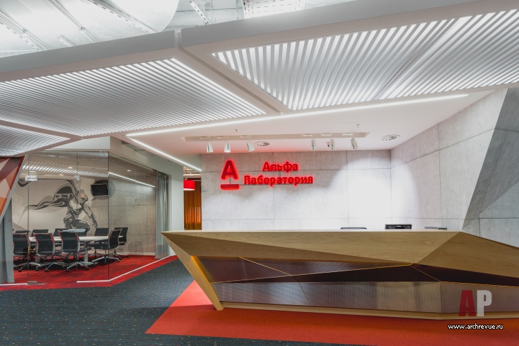 Архитектурное бюро IND Architects спроектировало рабочее пространство для специального подразделения «Альфа- Банка», которое занимается электронным бизнесом и созданием электронных сервисов. Офис «Альфа-Лаборатории» создан с расчетом на молодых и энергичных сотрудников, он сильно отличается от консервативных банковских интерьеров и призван стимулировать к творчеству и нестандартным идеям. За основу концепции архитекторы взяли образы супер-героев и стилистику уличного искусства.