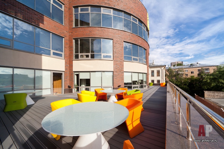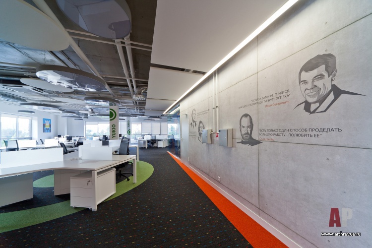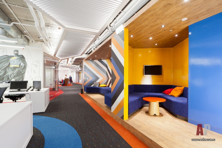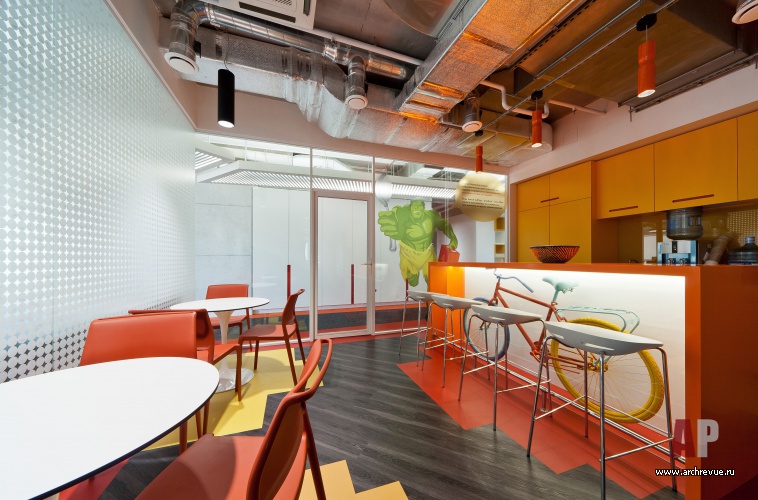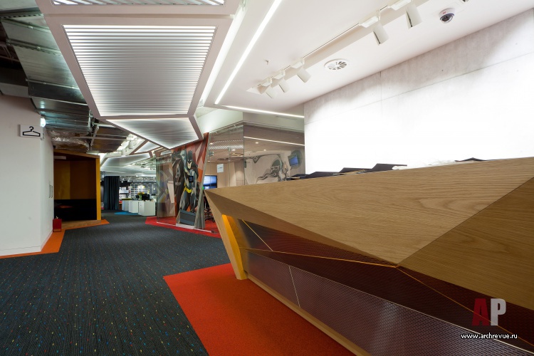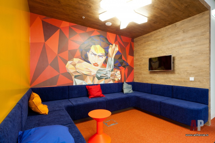 Яркая цветовая гамма и активная геометрия – прекрасно подходят для образа нацеленной на генерирование новых идей молодой команды. Ставка сделана на современные материалы: фактурный бетон, перфорированный металл, стекло различных вариаций (прозрачное, матовое, с рисунком), дерево. В ключевых зонах стены оформлены фотообоями с изображением супер-героев, в рабочих помещениях использованы специальные покрытия, на которых можно писать маркерами или крепить информационные материалы.