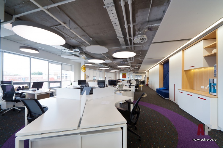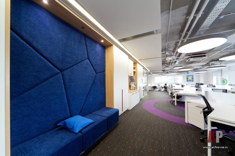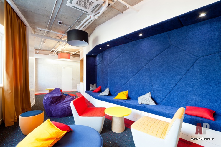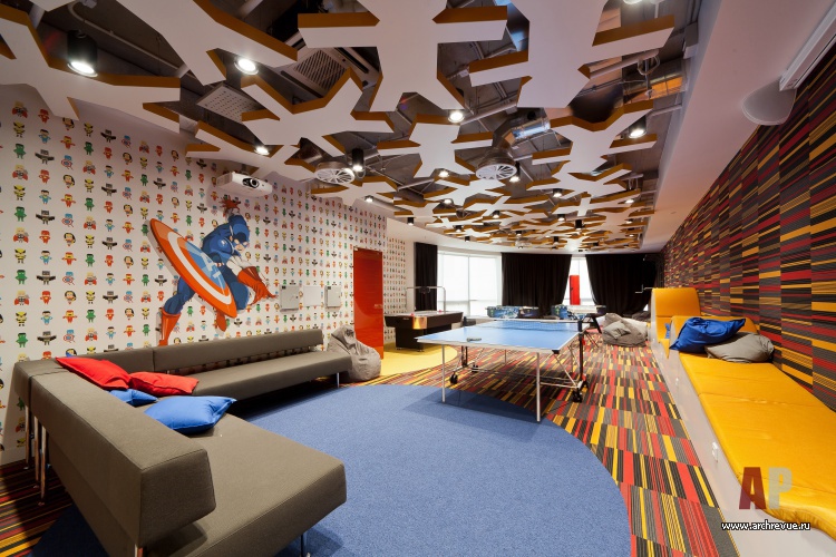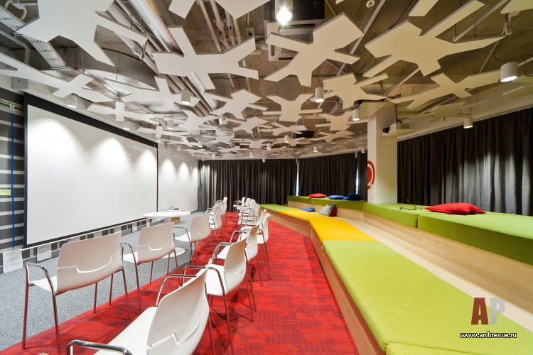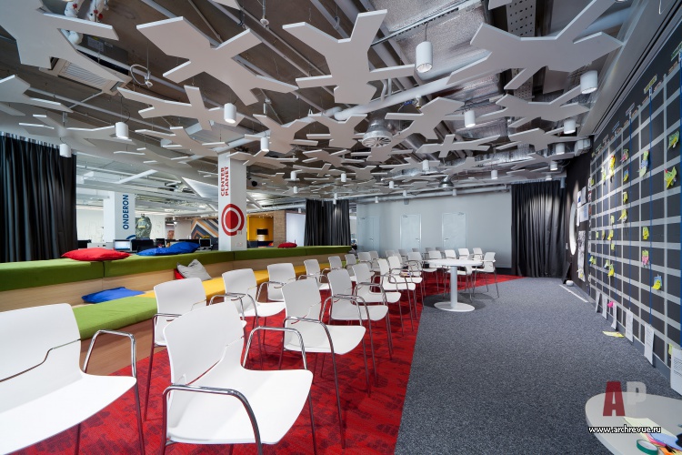 Но самое большое внимание привлекает потолок в зоне презентаций и гейм-зоне: он сложен из силуэтов людей (что символизирует командную работу) и дополнен подсветкой. Помимо визуальных эффектов такое решение улучшает акустику помещений.