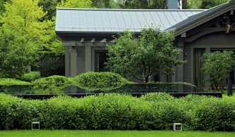 Офис занимает площадь 350 кв. метров и нацелен на проведение деловых встреч и приемов. Центральное помещение в нем – кабинет руководителя с панорамным остеклением и выходом на открытую веранду. Кабинет представляет собой открытое многофункциональное пространство с несколькими зонами: рабочей группой, переговорной, зоной отдыха.