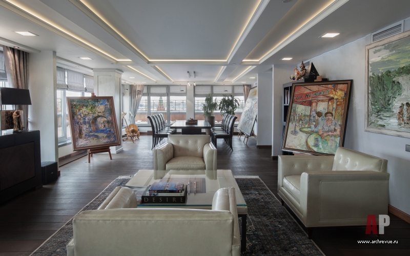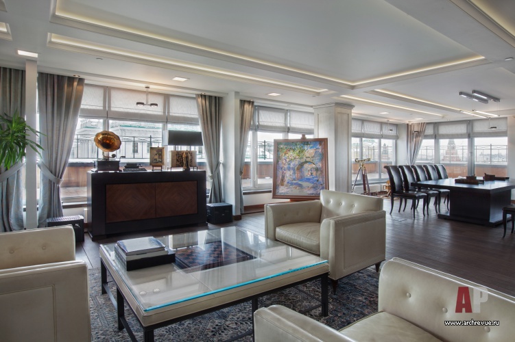 Отсюда контрастная цветовая гамма и сложная неоклассическая графика потолка, созданная с помощью лепных карнизов и молдингов. Роскошный вид из окна сделан частью интерьерной композиции: портьеры и римские шторы нейтрального цвета не акцентируют на себе внимание. В то же время благодаря тканям с фактором защиты от солнечных лучей позволяют избежать перегрева помещения.
