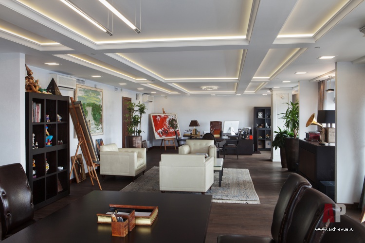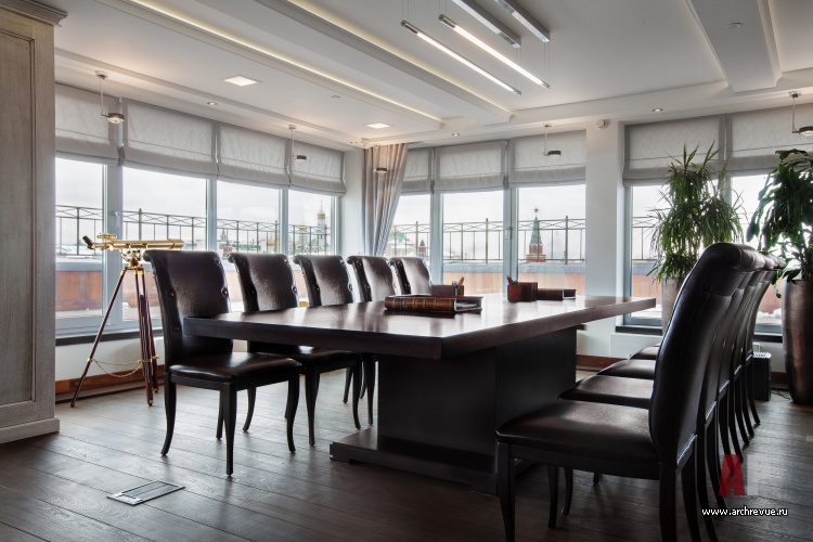Перед архитектором Валерией Лебедевой была поставлена задача спроектировать и оформить представительский офис крупной компании в самом центре Москвы. Пространство занимает последний этаж офисного здания, его панорамные окна и открытая терраса обращены на Кремль. Основной идеей имиджевого интерьера для деловых встреч и приемов стала респектабельная классика.