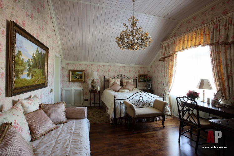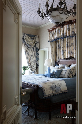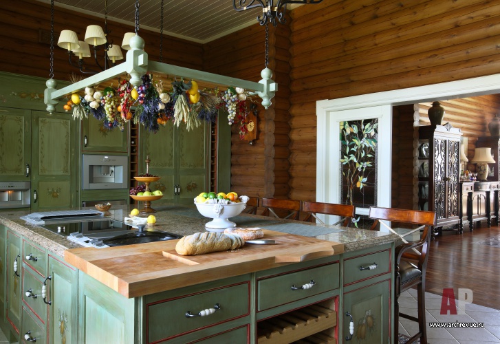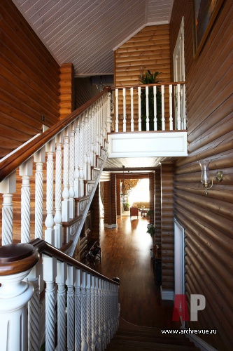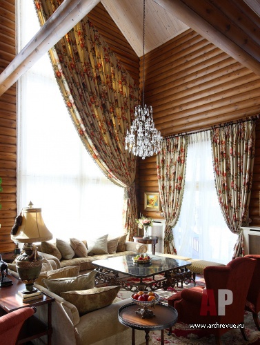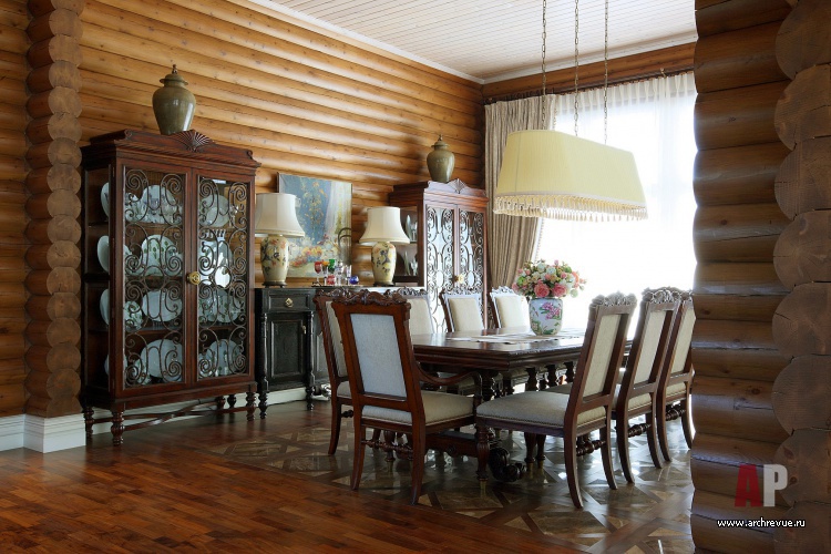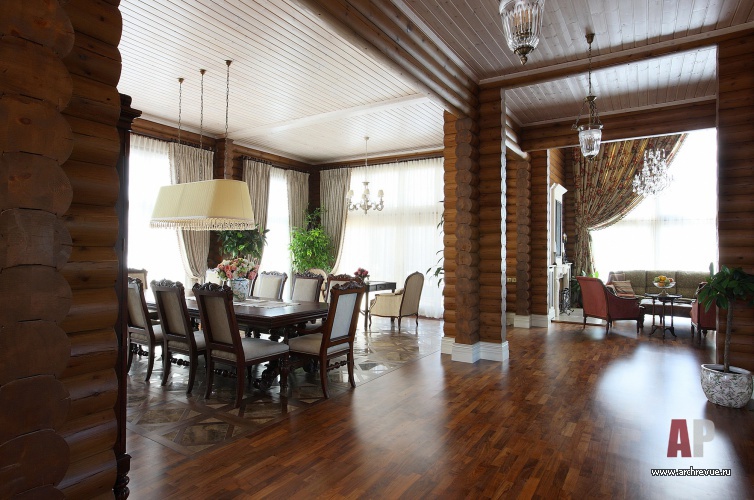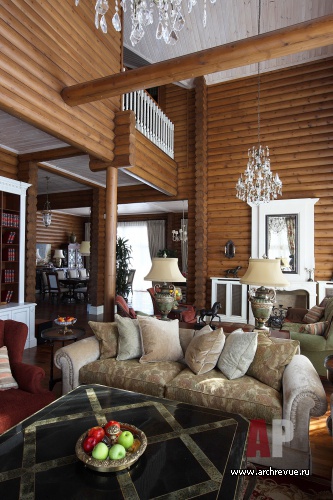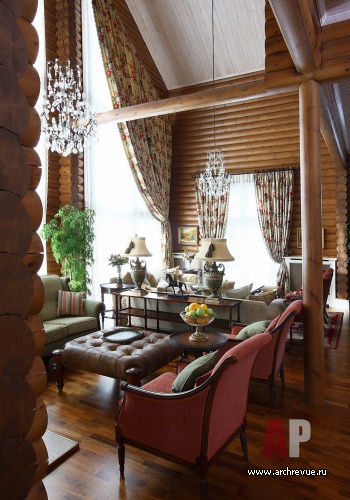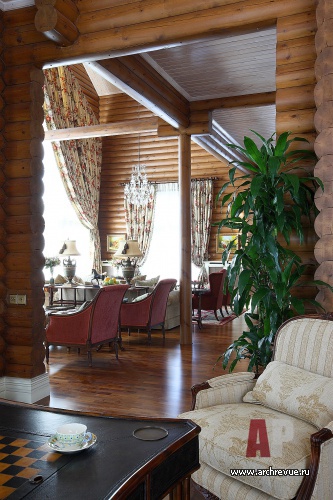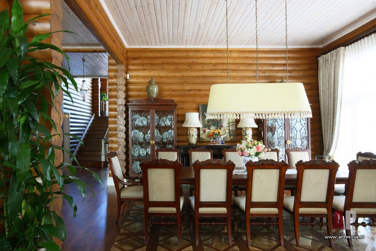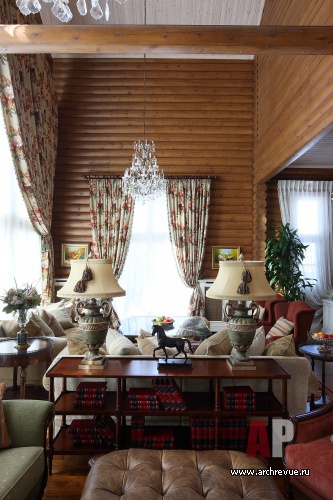 При декорировании особняка декоратор Ольга Кушнарева-Леоне стремилась найти баланс между фактурой открытых бревен и парадным декором. Чтобы обилие дерева впоследствии не утомило заказчиков, она предложила компромисс между кантри и парадной классикой: максимально сохранила открытую деревянную кладку на первом этаже и оформила английскими обоями и керамической плиткой помещения второго.