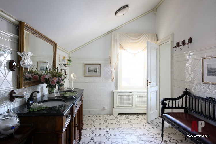 На первом этаже брус тонирован под темное, уже «пожившее» дерево, он контрастирует с белыми крашеными массивными наличниками, дверями и плинтусами. Потолки во всем здании обшиты вагонкой, тонированной под цвет дверей. Наличники, плинтусы, двери, резные балясины лестницы – все эти элементы отсылаю к оформлению старинных усадебных домов. А мебель из темного дерева, кухня в стиле кантри, цветочный текстиль вызывают в памяти традиционные английские особняки, неподвластные ни времени, ни моде.