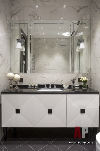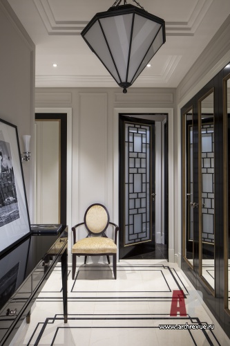 Заказчики поставили задачу создать современный элегантный интерьер, дизайнер предложила добавить ноты ар-деко. Декоративные приемы и изделия, отсылающие к началу ХХ века, добавили роскоши и респектабельности, и в то же время акцентировали геометрию пространства.