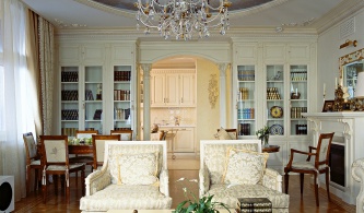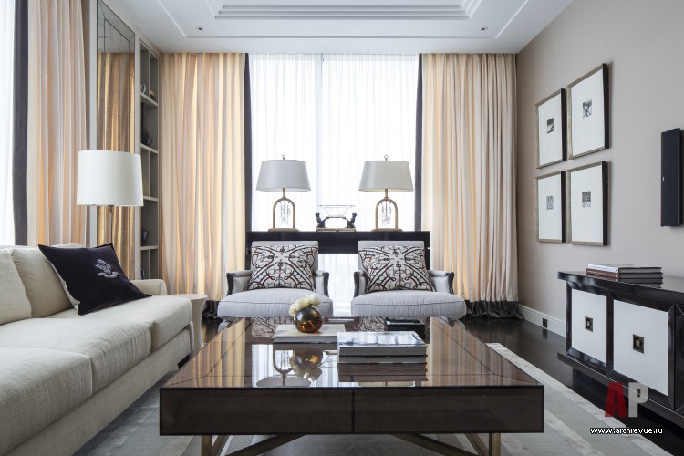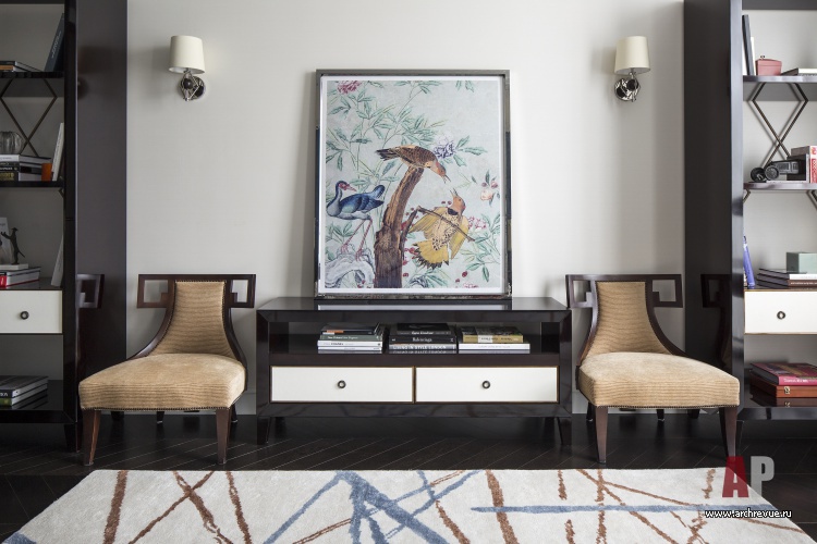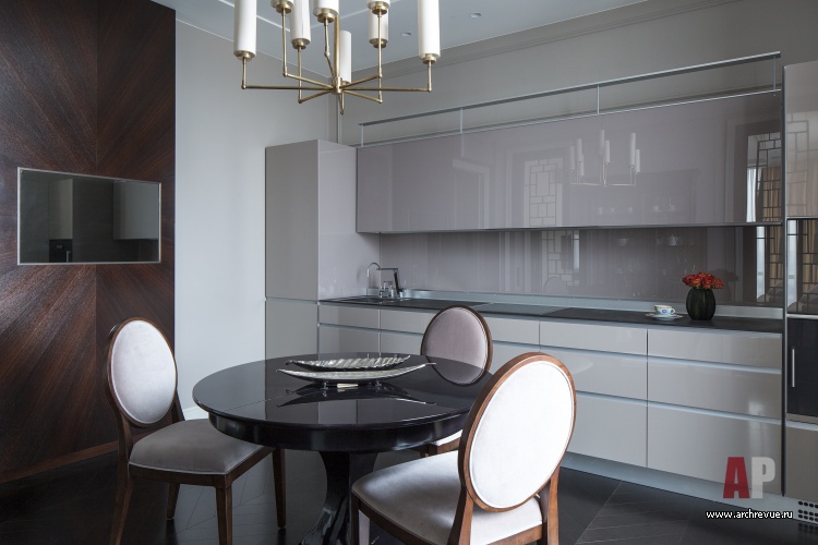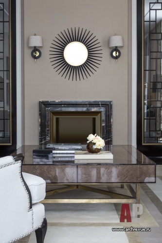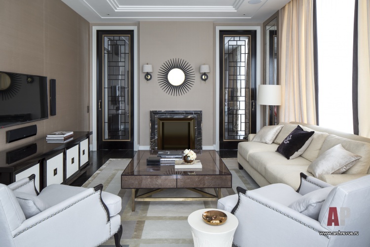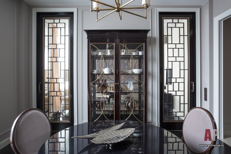 Гостевая часть квартиры включает гостиную с мягкой группой и камином, по обе стороны от которого расположены высокие двери из стекла и латунных вставок в обрамлении темного лакированного дерева. Симметричные конструкции – раздвижные, за ними скрывается парадная столовая и кухня.