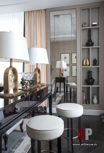 Основными декоративными акцентами стала авторская мебель и двери из ценных пород дерева и латуни.