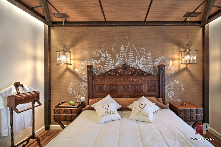 Струящиеся волны настенных 3D панелей, расположенное в зоне кухни мозаичное панно в сине-бирюзовых тонах, витражный потолок в столовой также поддерживают морскую стилистику. Максимально тема океана сконцентрирована в интерьере ванной комнаты: полы в виде гальки, фреска с изображением прибоя, плитка, имитирующая водную рябь, синяя ванна – вызывают ассоциации с водной стихией. В декоре спальни акцент сделан на стилистку азиатских курортов, кальянной – на яркий марокканский декор.