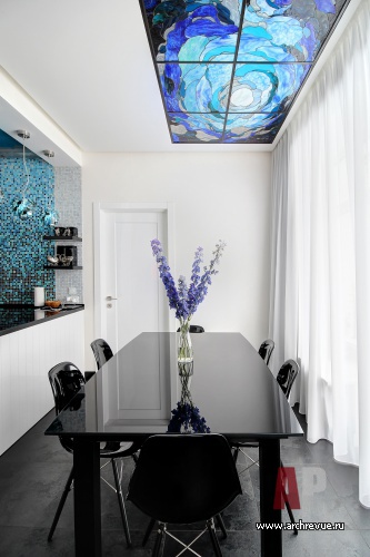 Интерьер квартиры площадью 155 кв. метров создавался для дайверов-путешественников. В декоре пространства прослеживаются приметы морской стилистики, а центральным элементом композиции гостиной является большой рифовый аквариум. Он не только поддерживает выбранную тематику, но и задает цветовую гамму, благодаря подсветке даже в вечернее и ночное время окрашивает стены в разные оттенки сине-голубого.