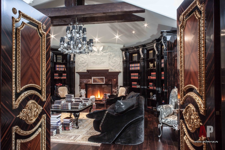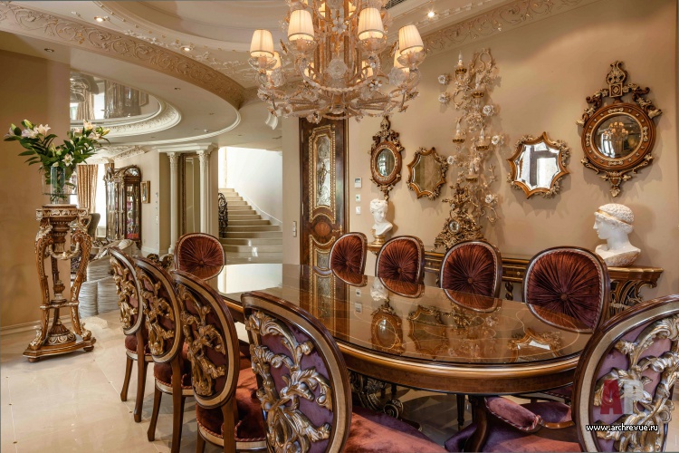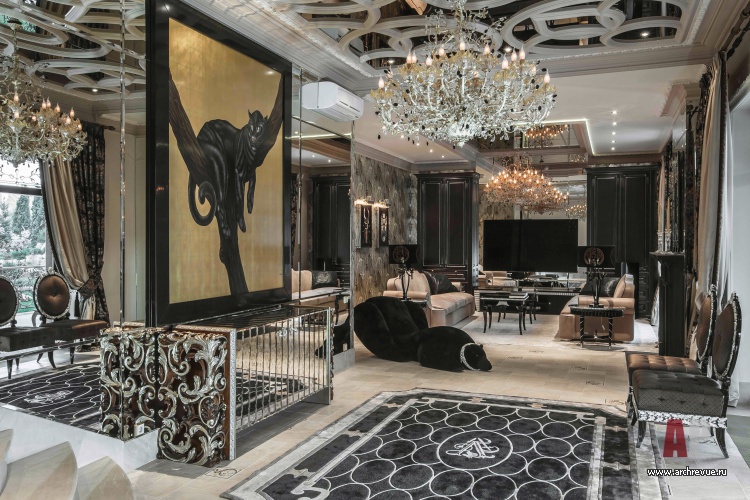Художественное решение дома – это игра с образами, формами, цветами. Если хозяйская часть исполнена в парадной классике со всеми атрибутами роскошного стиля (лепниной, патиной, мрамором, резным золоченым деревом и хрусталем), то в зоне для приемов ставка сделана на более театральную стилистику, вдохновленную мебелью Visionnaire.