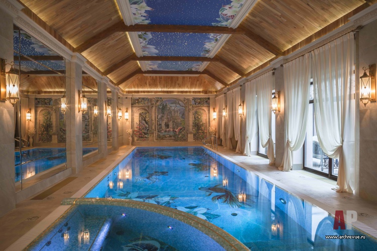 Черный цвет, зеркала, хромированный металл, современная роспись по состаренному золоту, эксцентричная мебель создают клубную атмосферу. Над обликом бассейна автор проекта работала в плотном тандеме с заказчицей, которая мечтала об атмосфере райского острова, роскошного курорта на Бали.