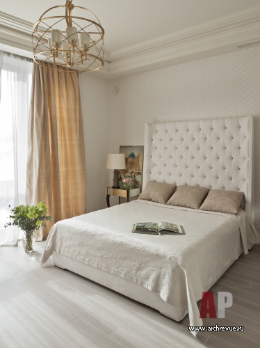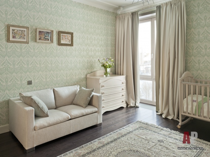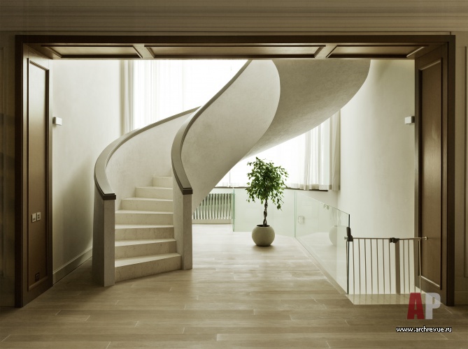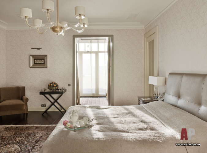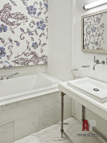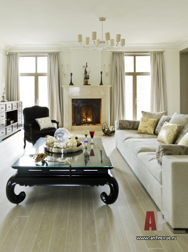 Консервативную обстановку создает светлая пастельная цветовая гамма, половая доска из выбеленного дуба, светлые филенчатые стеновые панели, текстильные обои в приватных помещениях придают им индивидуальный вид. Американская мебель Barbara Barry, авторские предметы и светильники добавляют элитарности в благородную обстановку.