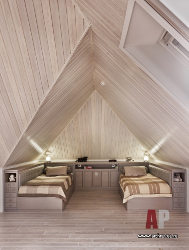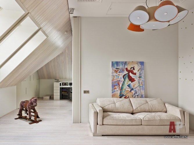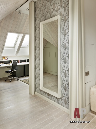 Второй этаж занимают спальни, а также хозяйский кабинет. Чтобы не создавать тесного коридора, перегородки кабинета было решено сделать из прозрачного стекла. В этом эклектичном приеме соединении традиций и новизны также видна отсылка к принципам реконструкции французскими архитекторами старинного наследия. В мансарде находятся детские помещения: спальни и игровые.