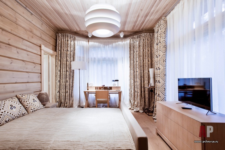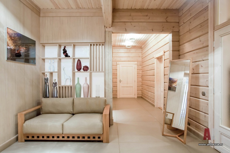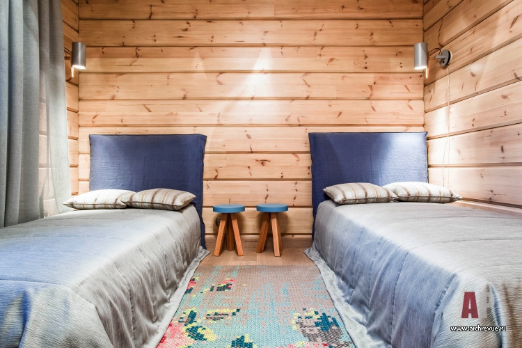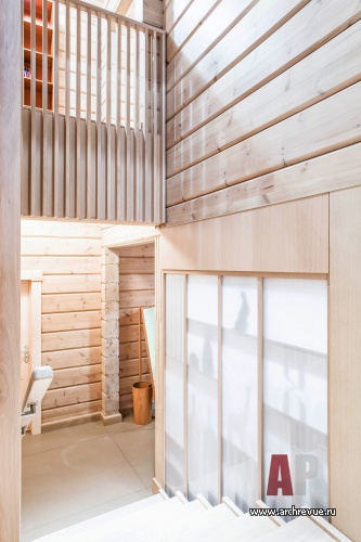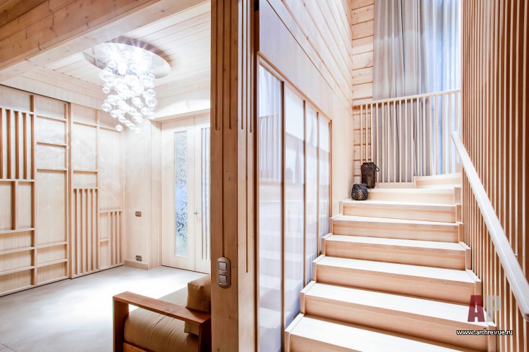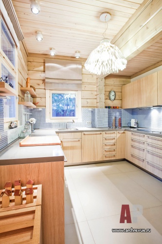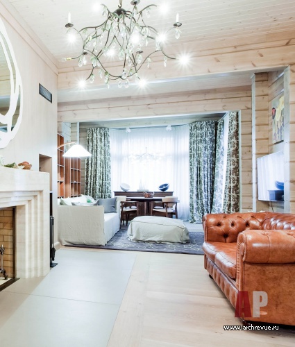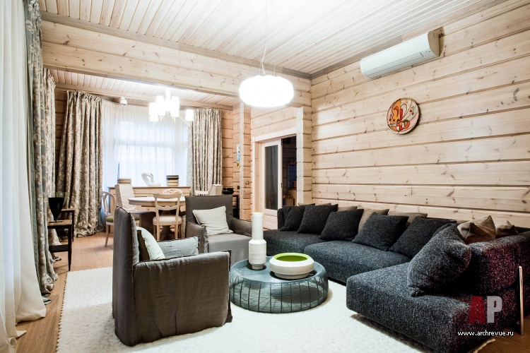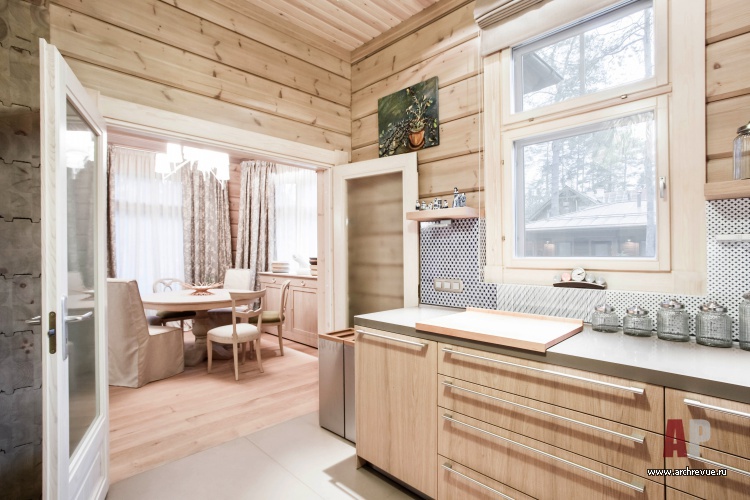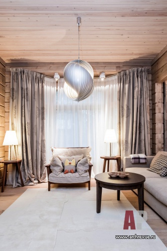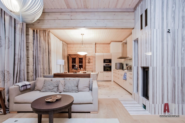 Дом выполнен в стилистике европейского фьюжн- дизайна. Отсюда и светлая, выбеленная колористика в природных оттенках серой сосны и глины, и исключительно природные материалы в отделке. С клееным брусом стен гармонируют модернистские авторские изделия из дерева, а также природного камня. Интерьер представляет собой легкий ироничный исторический микс.