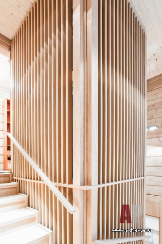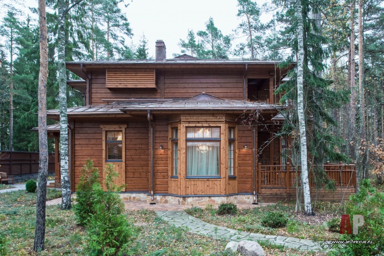 Специфика места – поселок находится на берегу Финского залива и скрыт от глаз сосновым лесом – определили природную направленность дизайна и архитектурные особенности деревянной постройки. Заказчики пожелали «растворить» дом в природе, сделать его частью эстетики места. Ради этой цели пришлось изменить яркой колористике компании Honka, в союзе с которой строился дом. Финские стандарты окраса бревен в желтый, охристый цвет не сочетались с природными материалами окружающей среды: мох, сосновая кора, ель, можжевельник. В итоге фасады выкрасили в приглушенные тона земли, глины, камней, серой сосны, свойственные традиционным бельгийским крестьянским домам и шале. Части вытянутого по ландшафту дома соединены террасами, что также усиливает связь с природой. Большое количество эркеров открывают вид в сад и лес.