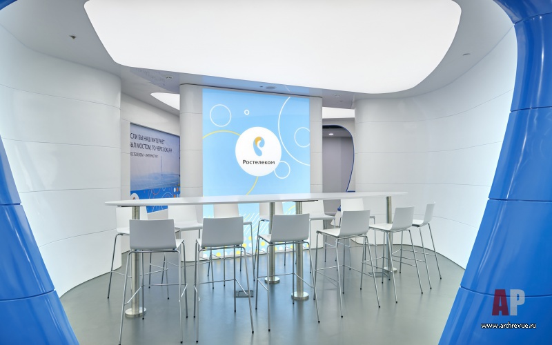 Корпоративный стиль компании присутствует в колористике пространства (яркие голубые и оранжевые акценты присутствуют на рабочих местах, во входных зонах, на декоративных панно со слоганами компании), а также в объемно-планировочных решениях. Так, например, мультимедийная зона и пространство во входных зонах имеют мягкую закругленную форму, которая напоминает элемент логотипа «Ростелекома».