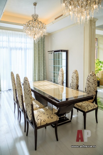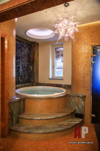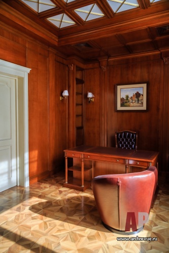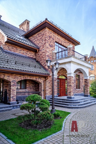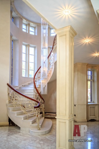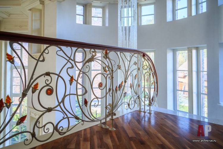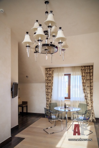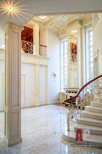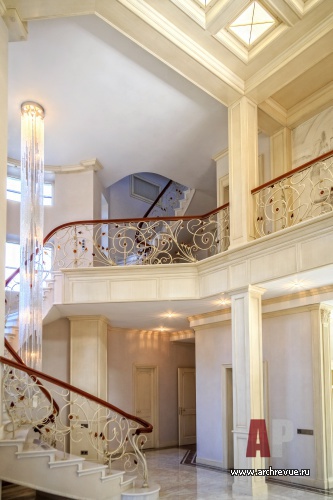 Интерьер дома выполнен в эклектичной манере: черты помпезной классики в нем объединены с современными тенденциями. Самое парадное помещение – каминный зал – исполнено в светлых тонах: камень, обои, патина кованого ограждения лестницы имеет нежный оттенок слоновой кости, от чего помещение кажется еще больше и наряднее. В декоре использованы авторские изделия из дерева, металла, гипса, камня.