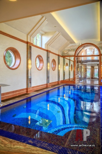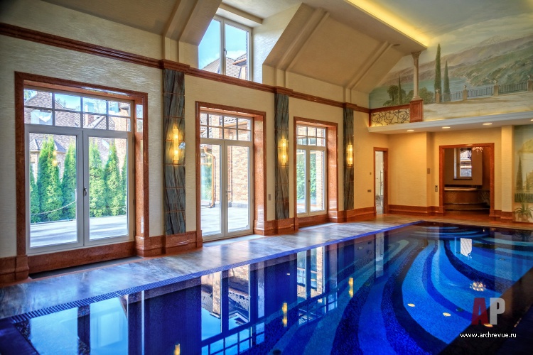 Из гостиной по длинной внутренней галерее можно попасть в еще один объем, где размещается бассейн со СПА-комплексом, зона отдыха, гаражи и технические помещения.