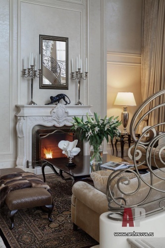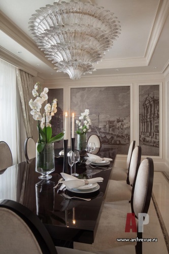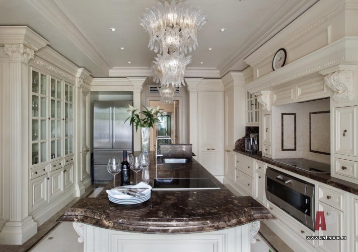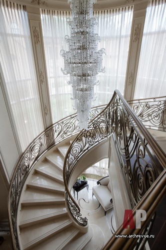 Заказчица поставила перед архитекторами задачу создать праздничный интерьер с настроением легкости, светлый и воздушный, без торжественной тяжеловесности и темного декора. Американская версия классического стиля с элементами ар-деко и ар-нуво подходила наилучшим образом. Большие пространства, крупные формы, светлые отделки, изысканная орнаментика создают элегантный классический образ.