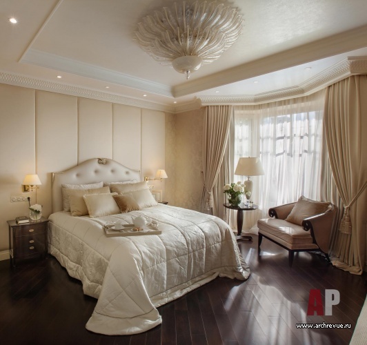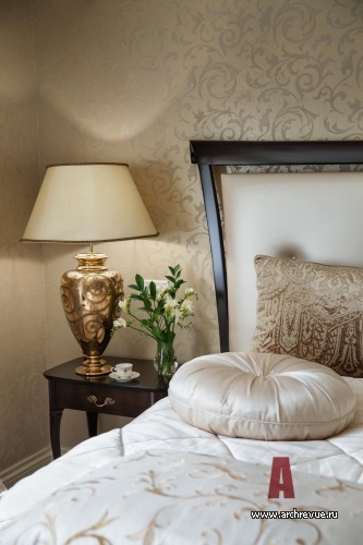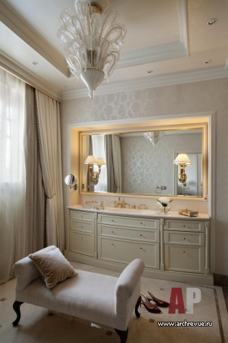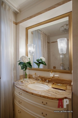 В их числе и светлая бежевая гамма, и полы из белого мрамора с изящным цветочным рисунком, и декоративные настенные панно в сепии. Материалы, фактуры, мелкие подробности в этом интерьере чрезвычайно важны, они придают ему нежность и женственность.