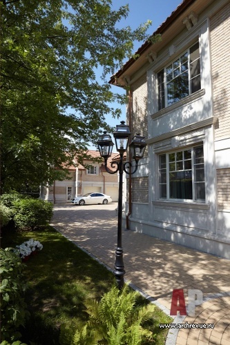 Дом расположен в подмосковном поселке с типовой застройкой, поэтому структура двухэтажного здания была задана изначально. Архитекторы лишь незначительно скорректировали внутренние пространства, достроили помещение бассейна и гаража, оформили фасады, придав им мягкий классический облик.