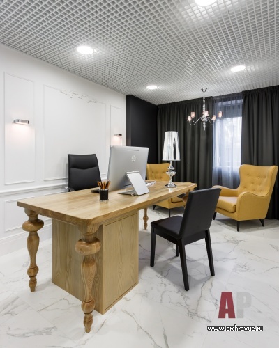 Декоративная база офисного интерьера – строгая черно-белая классика, усложненная деталями в стиле фьюжн. В контрастных цветах исполнена входная группа, где черным выделена одна из стен, а также мягкая мебель и абажуры светильников. Зрительно небольшой объем уравновешивает стойка рецепции с резным ножками светлого дерева и зеркальным фасадом. В кабинете адвоката внимание привлекает массивный стол на резных ножках и мягкая группа для приватных бесед.
