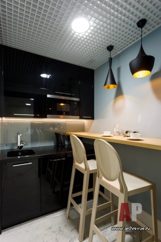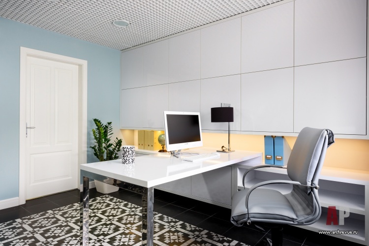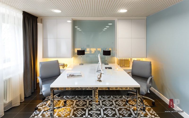 В кабинетах использован дополнительный цвет – серо-голубой – в нем решены лаковые фасады встроенных шкафов, фрагменты стен. Мозаичная черно-белая напольная плитка отсылает к историческим интерьерам и работает на образ надежной и респектабельной компании.