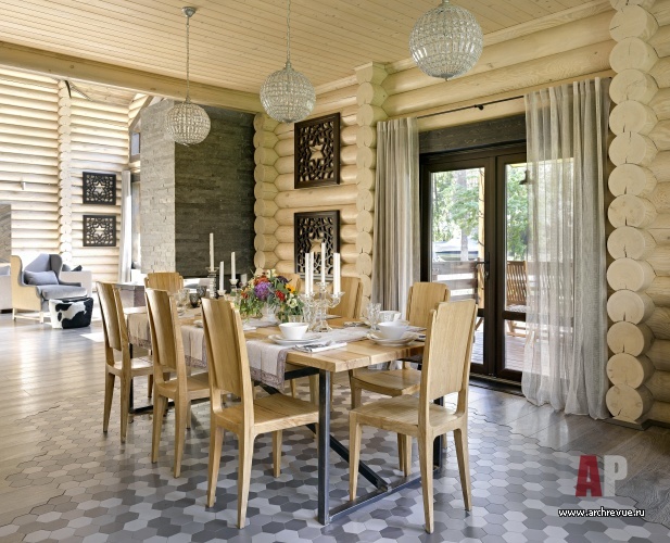 С цветом натурального светлого дерева бревенчатых стен они смиксовали метлахскую (в столовой) и андалузскую (в ванной) плитку, авторскую мебель (например, кухня делалась на заказ), предметы в стиле contemporary.