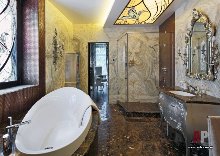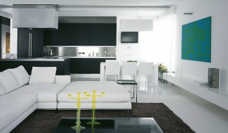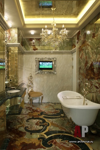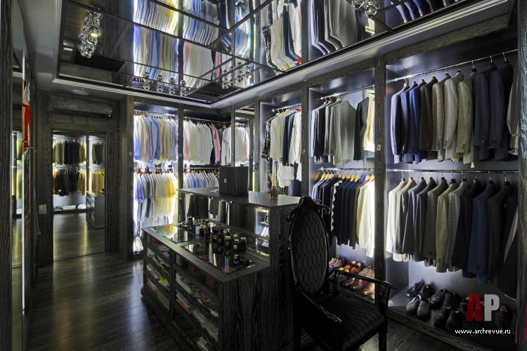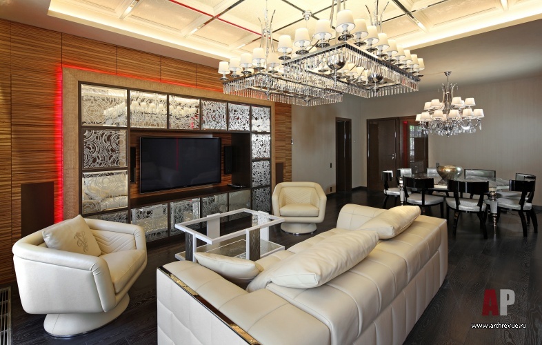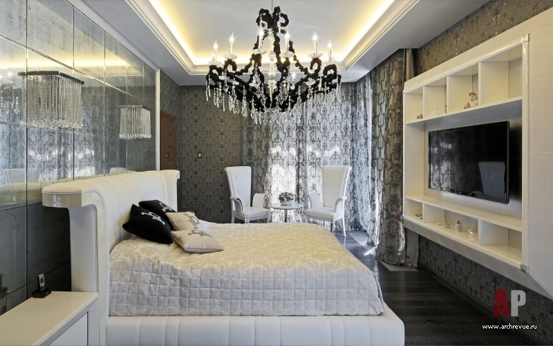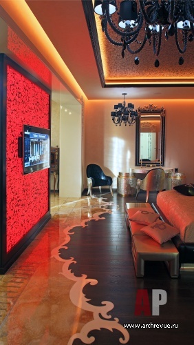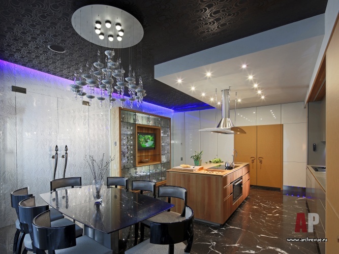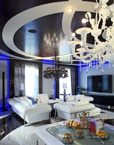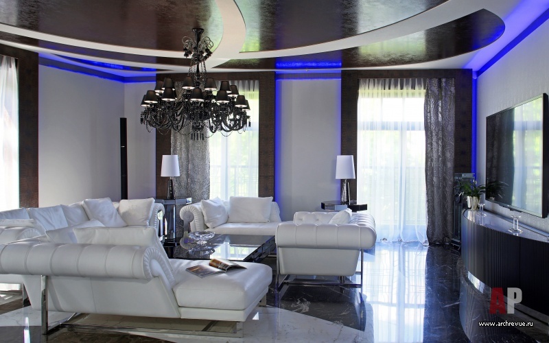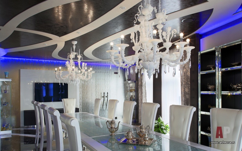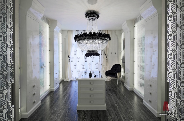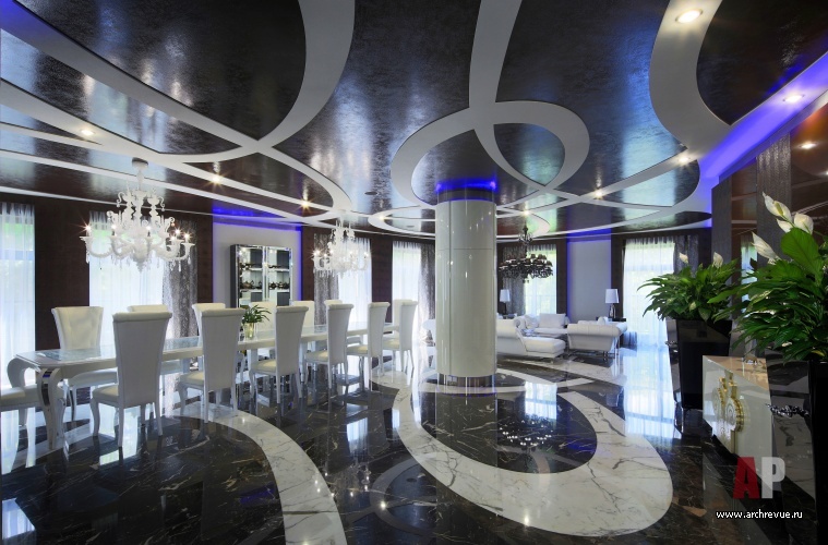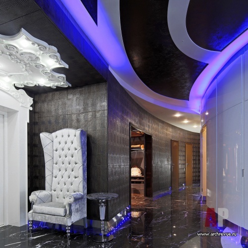 Черно-белый контраст поддерживается мебелью и неоклассическими светильниками. Декоративную игру поддерживают контрастные фактуры: лаковые панели сочетаются с гладкой кожей, бетон с экзотическим деревом, кожа питона со стеклом, испещренным пышным узором, камень с бетонным покрытием. Но тон задает сложная динамичная подсветка со встроенными светодиодами, в считанные секунды она способна преобразить строгий неоклассический интерьер в модное светское место.