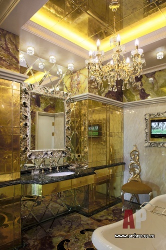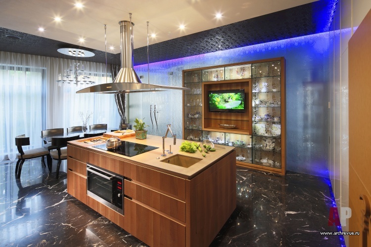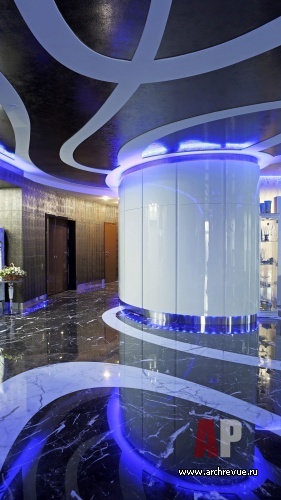 Архитекторы бюро «Дом-А» предложили сделать ставку на сложную светодиодную подсветку, эту идею заказчики восприняли с воодушевлением. Общая стилистика интерьера в процессе работы претерпела изменения: от жесткого минимализма до неоклассики с экстравагантной мебелью и светильниками фабрики Visionnaire.