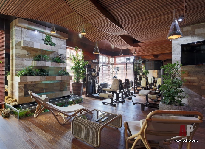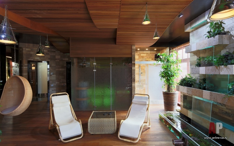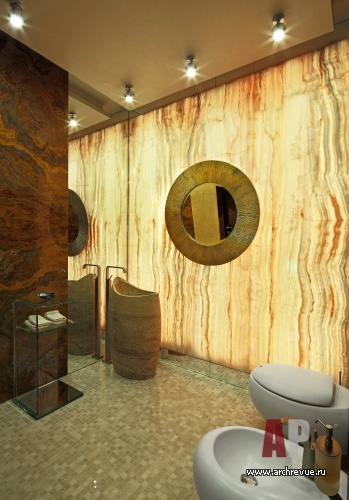 Плавные текущие линии, округлые формы, радиусные коридоры, цилиндрические объемы задают ритм и формируют удобное для жизни пространство. Квартира разделена на три блока: в одном сгруппированы все общественные помещения – парадный полукруглый холл, выходящий в общую гостиную с обеденной группой (место для приемов), изолированная малая гостиная с зоной ТВ и обеденной группой (камерное место сбора членов семьи) и изолированная кухня с зоной для завтраков. В левом крыле квартира находится СПА-зона с процедурным кабинетом, тренажерным залом, сауной и водопадом. Она соединяется с приватными помещениями хозяев дома дугообразным коридором. Он подчеркивает геометрию пространства и задает вектор движения.