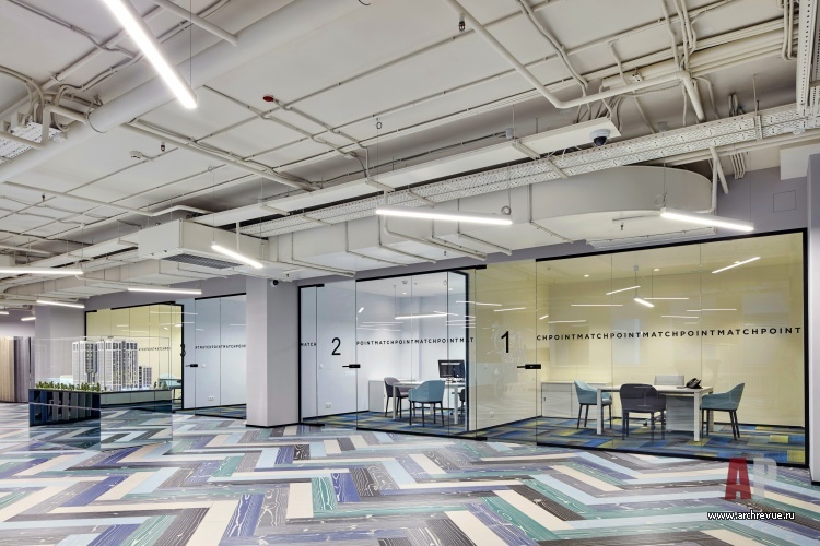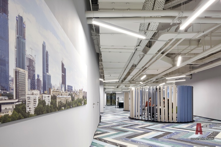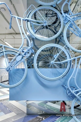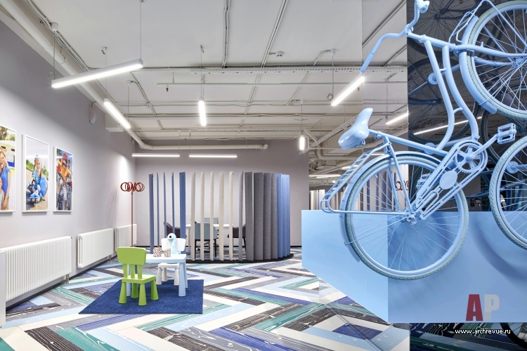 Значительная часть пола выложена керамогранитом, он имитирует деревянный паркет «елочкой» в сине-серой гамме. В переговорных его поддерживает сходный по колористике и стилистике ковролин. Современная мебель, инсталляция из велосипедов на входе, дизайнерские светильники придают интерьеру актуальный моложеный вид.
