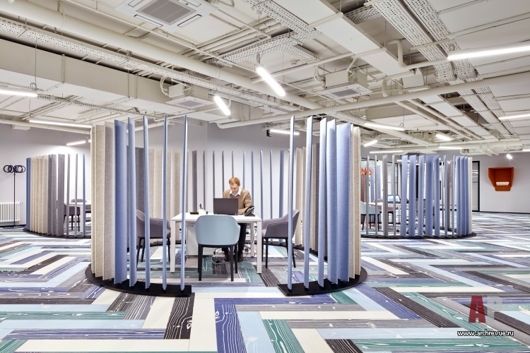 Офис занимает один зал: просторное помещение разделено на разные функциональные зоны, которые частично или полностью изолированы. Часть переговорных и сейл-зон вынесены в стеклянные блоки, другие – организованы внутри полукруглых островов, обозначенных ширмами из поворотных ламелей, обтянутых фетром.