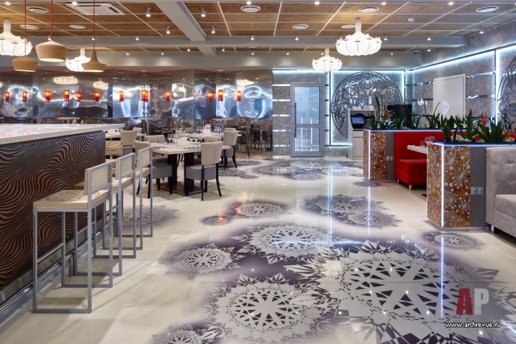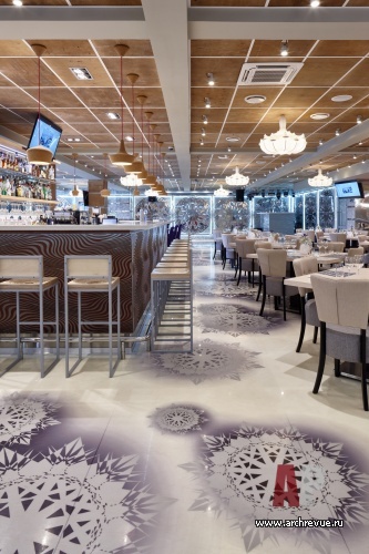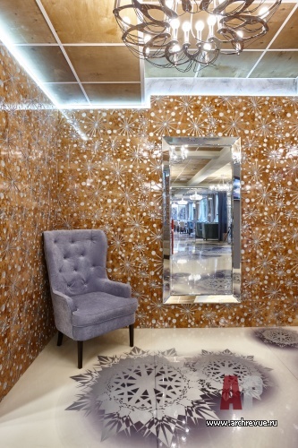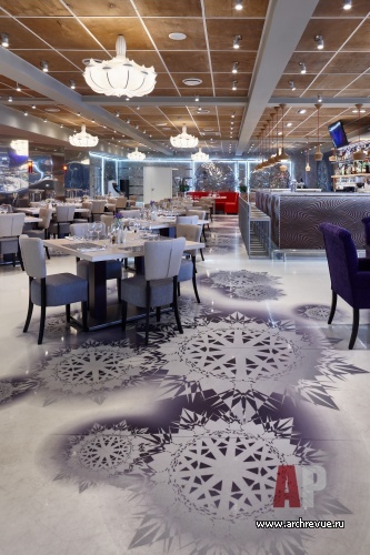 Такой подход позволил максимально эффектно «вести» проект на удалении, достичь выразительного эффекта с помощью экономичных отделочных решений. Наливные полы с гигантскими снежинками, стеновые панели Ultimatuli со светящимся в темноте покрытием, стальные зеркальные панели на стенах с эффектом снежного вихря и панно из трехметровых филигранно вырезанных металлических снежинок придают интерьеру яркую образность. Дополняют ее световые эффекты и встроенные подсветки.