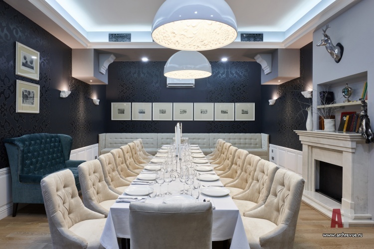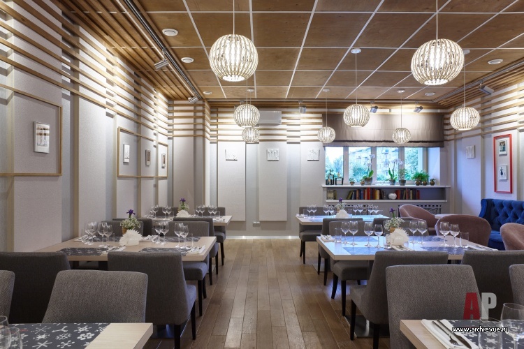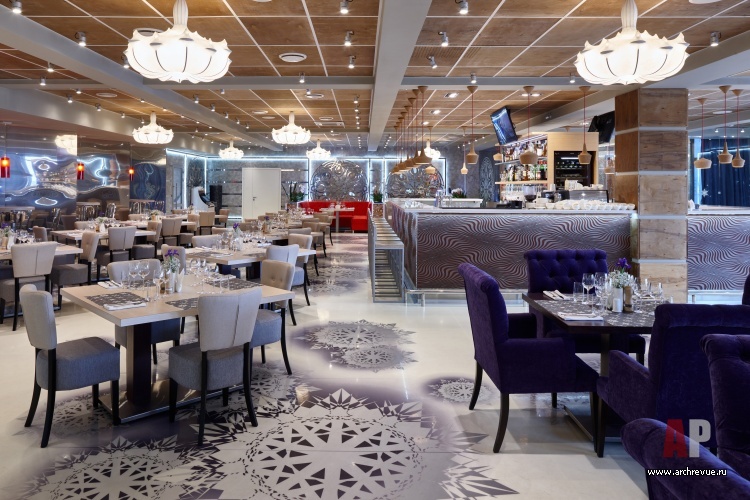 Здесь отдельно выделена барная зона, столики на четверых с креслами, диванные группы, столики для быстрых завтраков и бизнес-ланчей в нишах… Отдельно спроектированы банкетный зал с камином и ВИП-зал с элементами стилистики ар-деко.
