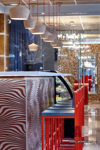 Положенный в основу декора принцип автор проекта определяет как «принцип широкого мазка» и оперирует большими объемами, доставшимися в наследство от бывшего советского ресторана, масштабными формами. Сам интерьер разработан по принципу конструктора, при котором использована модульная схема набора отделки стен, полов, потолка.