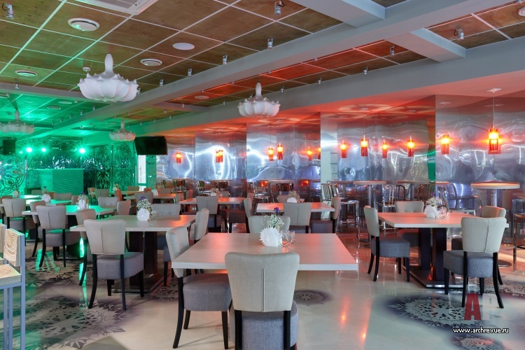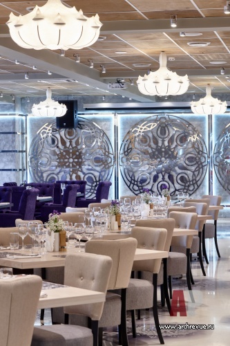 Ресторан площадью 600 кв. метров занимает одноэтажный объем, где раньше находился советский ресторан. Его ядро – главный зал, который представляет собой огромное помещение, зонированное декоративными элементами и мебельными группами. От системы подиумов авторы проекта отказались, чтобы сохранить высоту потолков.