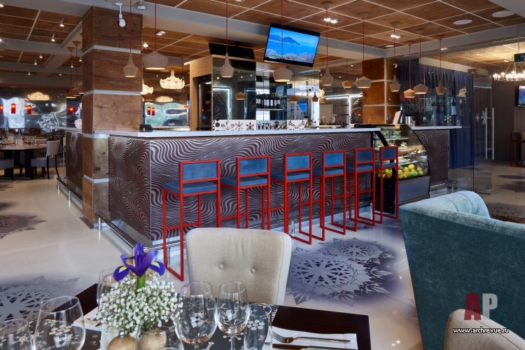В городе Снежинск, распложенном в Челябинской области, дизайнер Лада Подольская оформила ресторан «Снежинка», в основу которого легла яркая образность, монументальная орнаментика, контраст цветов и фактур. Заведение, совмещающее функции дневного ресторана и вечернего клуба, находится в одноэтажной постройке советского периода, которое дизайнер переоборудовала с учетом современных условий.