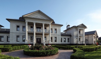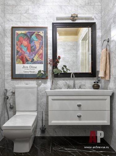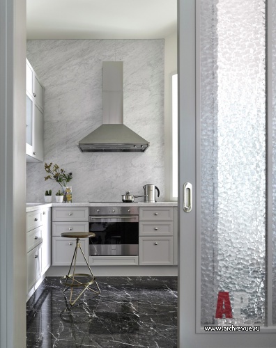 Кухня оформлена белым мрамором с серыми прожилками, который отлично сочетается с лаконичными белыми фасадами кухни. Интерьер строится на нюансах цветов и фактур, линии неоклассики поддерживают авторские белые двери удлиненного силуэта с рельефными витражами, лепные карнизы, наборный паркет. Американская мебель и изысканные светильники отсылают к традиционным интерьерам Нового Света.